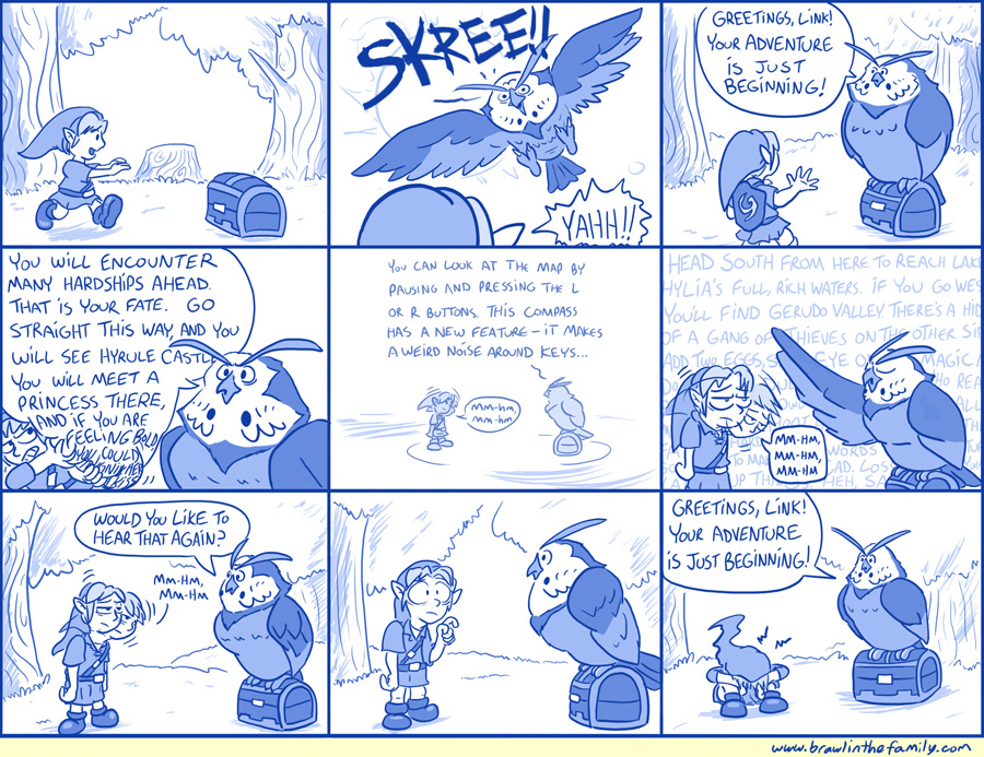 In unserem letzten Comic der Woche ist Link, der Held der The Legend of Zelda Spiele zu sehen. Es zeigt, dass auch Videospiele Charaktere genervt sein können, wenn sie unnötig lange Texte gleich mehrmals hören müssen.
