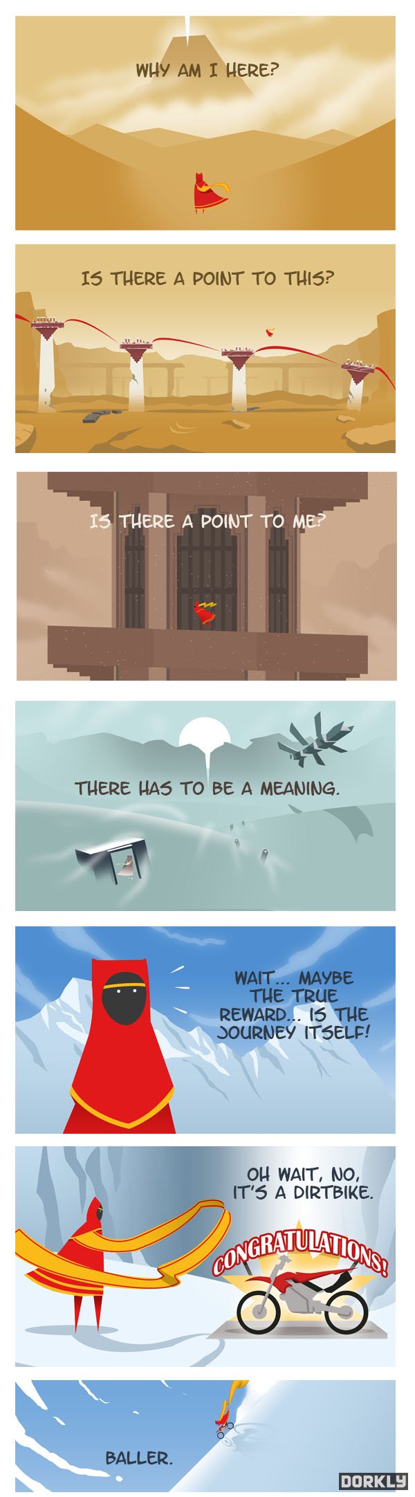 Diese Woche macht ein Comic aus dem Hause dorkly den Anfang, der sich mit dem neuesten PlayStation 3-Titel Journey befasst. In Journey schlüpft ihr in die Rolle einer namenlosen Figur und mit nur einer Aufgabe: zum Berg gelangen. Warum ihr zu diesem Berg gelangen wollt und weshalb ihr diese mühsame Reise überhaupt auf euch nehmt, müsst ihr selbst rausfinden. Wobei die Lösung von Julia Lepetit auch sehr plausibel erscheint.