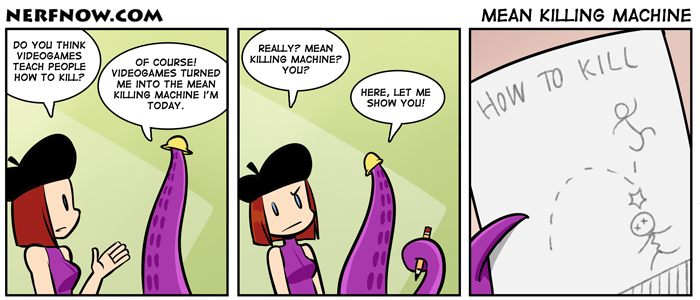 Unser zweiter Comic beschäftigt sich diese Woche mit einem Thema, das vor allem in der deutschen Politik immer wieder Anklang findet. Es geht nämlich um die Frage, ob uns Videospiele zu potentiellen Amokläufern machen. Wie zuletzt herauskam, hat zum Beispiel der Attentäter von Norwegen diverse Online-Spiele gespielt, so zur Überraschung auch World of Warcraft. Ist nun jeder von uns ein potentieller Massenmörder oder nicht? Dem stehen die Autoren von Nerf NOW!! sehr sarkastisch gegenüber.