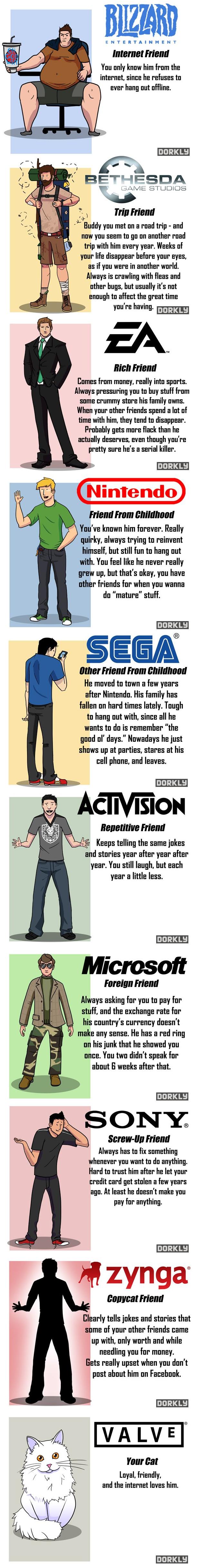 Unser zweiter Comic stammt aus der Feder von Julia Lepetit und Andrew Bridgman. Diese beiden klugen und kreativen Köpfe haben sich nämlich überlegt, wie die großen Videospiel-Unternehmen als reale Personen aussehen würden. Und nicht nur als menschliche Personen, sondern auch noch als Teil eures Freundeskreises, inklusive der Erklärung, was für eine Art Freund sie wären. Viel Spaß mit der Erkenntnis, was für Freunde euch durchs Leben begleiten.