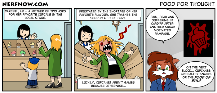 Und damit wollen wir auch gleich den heutigen Comic-Reigen eröffnen. Die Kollegen von Nerf NOW!! haben sich dem Thema “Videospiele machen böse” angenommen. Scheinbar gab es vor Kurzem in Cardiff eine Mutter, die einen Backwaren-Geschäft kurz und klein gehackt hat. Mich erinnert dieser Comic vor allem an die Kampagne “100% aller Amokläufer aßen Brot!”.