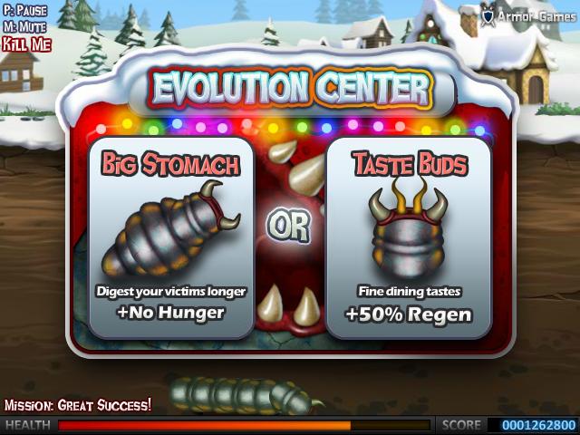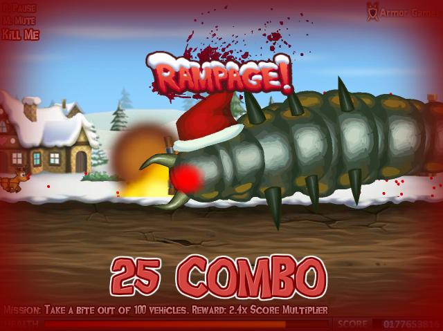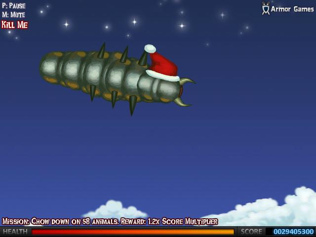Vom Gameplay her ist unser heutiges Flashgame sehr simpel. Ihr steuert den Effing Worm mit den Pfeil- oder WASD-Tasten. Eure obere Pfeiltaste/ die W-Taste dient dabei zur Beschleunigung und die linke Pfeil-/A- bzw. rechte Pfeil-/D- Taste wird zur Steuerung des Wurmes benötigt. Wie bereits gesagt, ist eure Hauptaufgabe Santa zu erwischen, doch bis es so weit ist, mĂĽsst ihr zunächst einige andere Kandidaten ausschalten. Dazu bewegt ihr euch mit einer Höchstgeschwindigkeit durch das Erdreich, um ab und zu, wie ein Tiefsee-Jäger im Meer, aus der Erdoberfläche herauszubrechen. Dabei solltet ihr im besten Falle einige eurer Opfer mit in die Tiefe reiĂźen, um euren Magen voll zu halten und die Mission zu erfĂĽllen. Denn Ersterer entspricht eurer Lebensenergie, und wenn diese auf null fällt, ist euer aktueller Versuch gescheitert. Deshalb empfiehlt es sich neben den Missionszielen auch andere Bewohner der Erdoberfläche zu konsumieren, um eure Energie oben zu halten. Die Missionen sind meistens sehr einfach, erfordern jedoch ab und zu etwas Geschick, weil eure Beute natĂĽrlich nicht stillsteht. An einer Stelle mĂĽsst ihr beispielsweise ein paar Elfen “nach dem Weg fragen” oder Feinde von hinten “ĂĽberraschen”. Somit ist zumindest ein bisschen Abwechslung gegeben und es geht nicht nur darum einfach alles zu fressen, was euch fĂĽr die Schnauze kommt.