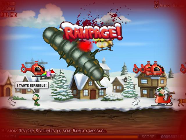 Lesezeit: 3 MinutenDer erste Schnee ist mittlerweile selbst im sonst nicht so verschneiten Westen gefallen. Grund genug, um unsere Weihnachts-Flashgame-Runde fortzusetzen. Dieses Mal bekommt Santa sein Fett weg. Jeder hatte sicher schon mal das Vergnügen ein weniger schönes Geschenk zu bekommen. Meistens wird das dann trotzdem akzeptiert und hinterher umgetauscht. Der Effing Worm hingegen sieht bei so einer Sache schnell mal rot und geht auf die Jagd, nach Santa.