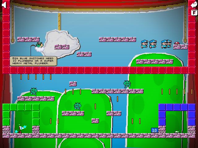Vom Grundaufbau her spielt sich Enough Plumbers 2 wirklich fast wie ein Super Mario Bros. Ihr habt euren kleinen Klempner und springt von Plattform zu Plattform und auch mal auf Gegner drauf. Bis dahin unterscheidet sich der Titel nicht sehr von anderen Plattformern oder dem klar erkennbaren Ideengeber. Der Unterschied wird dann ersichtlich, sobald ihr anfangt die Münzen im Spiel einzusammeln. Im Gegensatz zu anderen Genre-Vertretern erhöhen die Münzen in Enough Plumbers 2 nicht euren Score, sondern die Anzahl eurer Spielfigur. Damit meine ich, dass jede gesammelte Münze einen Klon eures Klempners erzeugt, sodass ihr am Ende mit einer ganzen Armee von Spielfiguren dasteht. Genau dieser Aspekt macht den Titel allerdings auch zu einem Puzzle-Spiel. An gewissen Stellen ist es nämlich nötig eine gewisse Anzahl dieser Klone am Leben zu erhalten, um beispielsweise einen Schalter zu aktivieren. Das ist jedoch leichter gesagt als getan, da ihr alle Figuren gleichzeitig steuert. Besonders knifflig war das in dem Level, das wie ein Kreuz aussieht, wovon ihr einen Screenshot in der Galerie findet. Ziel des Levels war es die Mitte zu erreichen und die Flagge zu berühren. Das Knifflige daran ist, dass die Flaggen hinter einer solchen “Zehn-Klone-Schalter”-Gemeinheit verborgen sind. Bis ich es geschafft habe zehn Klone in einen der horizontalen Gänge zu bekommen und dann auch noch an den ganzen anderen Schalterrätseln vorbei, war mehr Glück als Verstand. Gerade die Tatsache, dass ihr alle Klone gleichzeitig steuert und so niemals jeden im Auge behalten könnt, macht das Spiel wirklich fordernd.