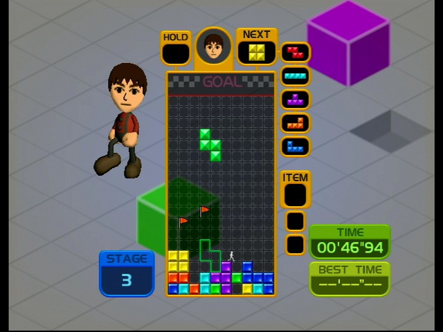 Der “Levelrenner”. Hier treffen Puzzle- und Rennspiel aufeinander. Durch eine vorgegebene Strecke muss ein Tetrimino geschleust werden, bis es die Ziellinie erreicht. Das klingt vielleicht einfach, ist allerdings soweit vom ursprünglichen Tetris entfernt, dass man komplett umdenken muss und nur allzuoft mit seinem Steinchen hängen bleibt.