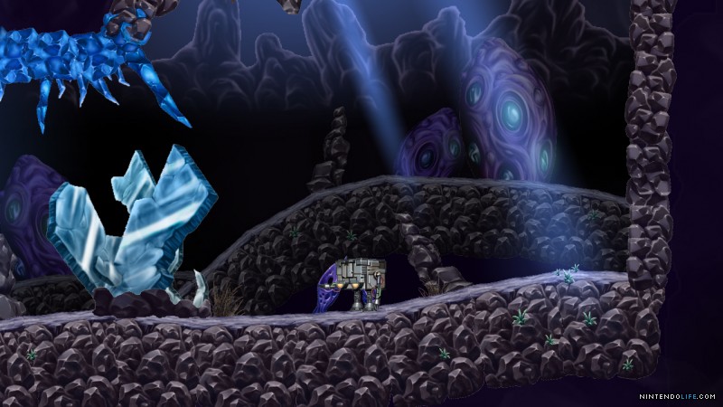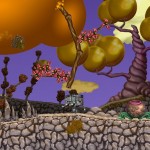 Nach unserem Absturz in der ausserirdischen Fremde, können wir nur leidlich hüpfen, was in einem Jump’n’Run sicherlich nicht besonders ratsam ist. Also ab in den Abenteuer-Modus und nc85 erkunden. Dieser Planet ist irrsinnig schön, bizarr und gefährlich zugleich. Was anfangs wirkt wie ein Sammelsurium von Schnecken, Gräsern, Fluginsekten, Felsen, Plizen, Sporen und gallertartigen Getümen und Ungetümen, entpuppt sich ziemlich bald als sehr gefährliches Terrain.