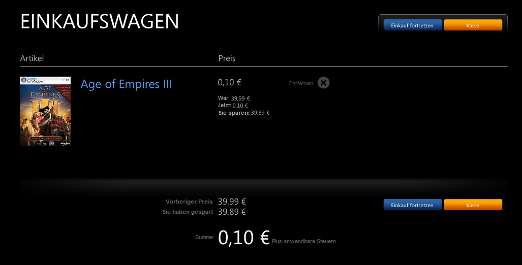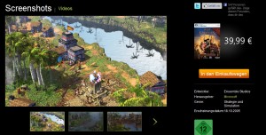Denn gelangt man das erste Mal auf die Produktseite im Windows Marketplace erscheint der normale Preis von 39,99 Euro. Wenn ihr euch wirklich für das Spiel interessiert, das beinahe ein moderner Klassiker ist, dann klickt auf den Button “Einkaufswagen”.