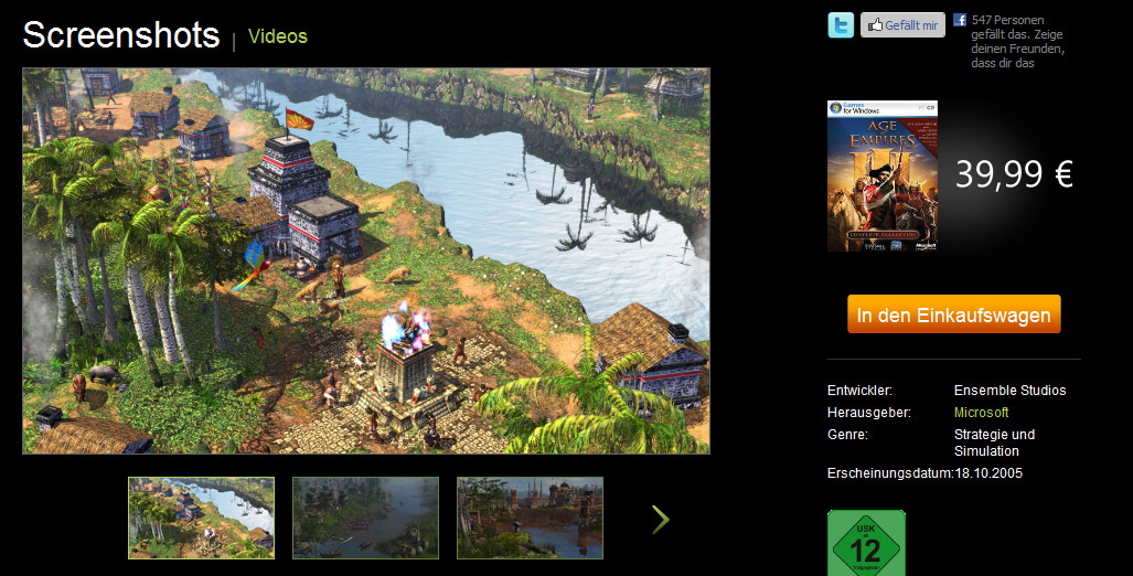 Lesezeit: < 1 MinuteJeder von uns spart ja gerne Geld. Was haltet ihr denn davon euch den Strategie-Hit Age of Empires III zu kaufen und 39,89 Euro zu sparen? Findet ihr nicht so toll? Dann ist euch wohl nicht zu helfen, denn derzeit kostet das 2005 erschienene PC-Spiel im Windows Marketplace tatsächlich nur 10 Cent. Noch günstiger geht also kaum noch. Was ihr dazu machen müsst? Einfach nur das Spiel online kaufen. Mehr Infos gibt es hier!