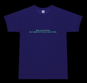 T-Shirt Nummer Drei dürfte vor allem Adventure-Liebhabern ein Begriff sein. Zumindest, wenn sie sich mit den wahren Klassikern dieses Genres beschäftigt haben. Denn im Lucas Arts’-Meisterwerk Monkey Island antwortet man beim Beleidigungsfechten auf den Satz “Du kämpfst wie ein dummer Bauer” mit… richtig: “Wie passend, Du kämpfst, wie eine Kuh!”.
