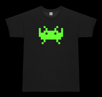 Den Anfang macht auch gleich eine wahre Größe des Videospiel-Universums: ein waschechter, leuchtend grüner Space Invader! Bereits seit 1978 machen diese Pixel-Aliens nicht nur Arcade-Hallen, Kinderzimmer und Wohnzimmer unsicher, sondern geistern inzwischen auch als Eiswürfelform, als stylische Schmuck-Anhänger oder gar als Wanddeko durch unser Leben, sondern zieren natürlich auch T-Shirts und andere Bekleidungsstücke!