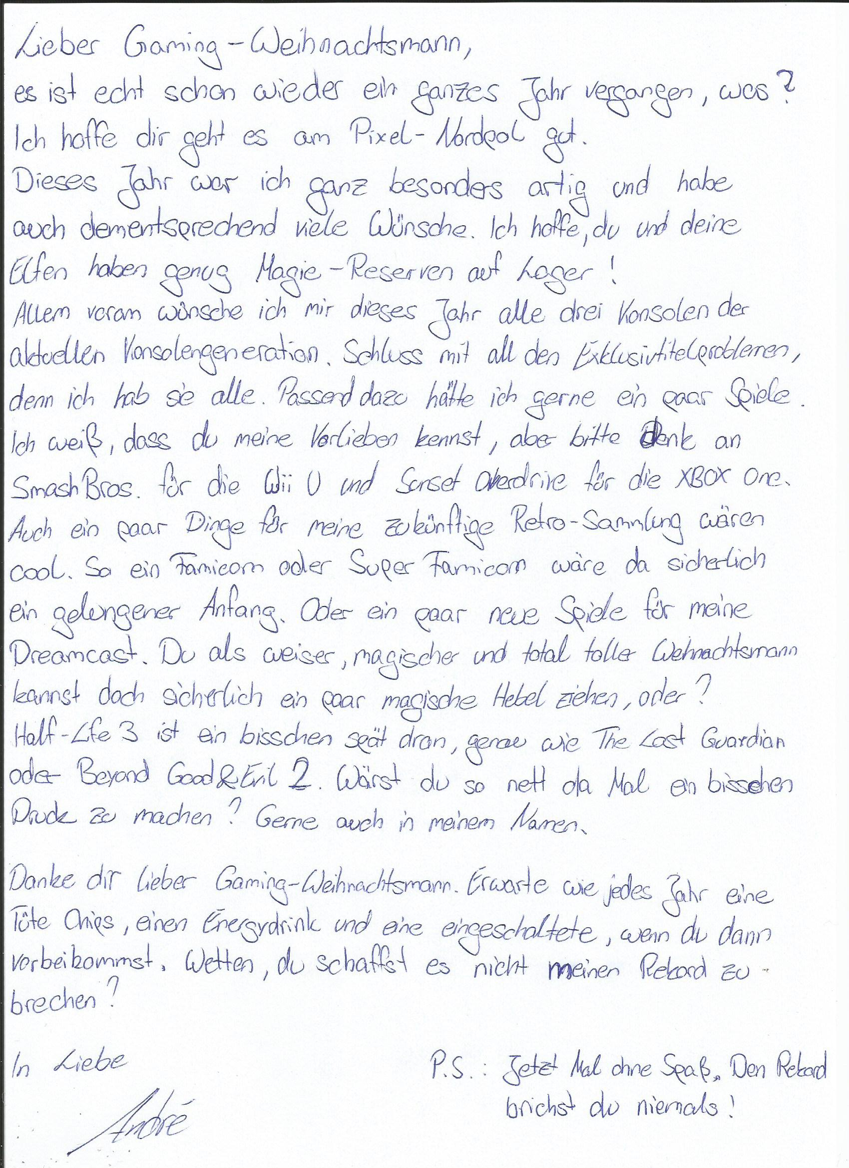 Lesezeit: < 1 MinuteJedes Jahr vor Weihnachten schreiben Tausende Kinder weltweit einen kleinen Brief, um ihre Wünsche dem Weihnachtsmann zu überbringen. Doch wer hat behauptet, dass nur Kinder solche Briefe schreiben dürfen? Wir von der IKYG-Redaktion sind der Meinung, dass auch wir dem (Gaming)-Weihnachtsmann sagen dürfen, dass wir artig waren und einige spezielle Wünsche haben. Aus diesem Grund präsentieren wir nun wöchentlich neue Wunschzettel. Heute: André.