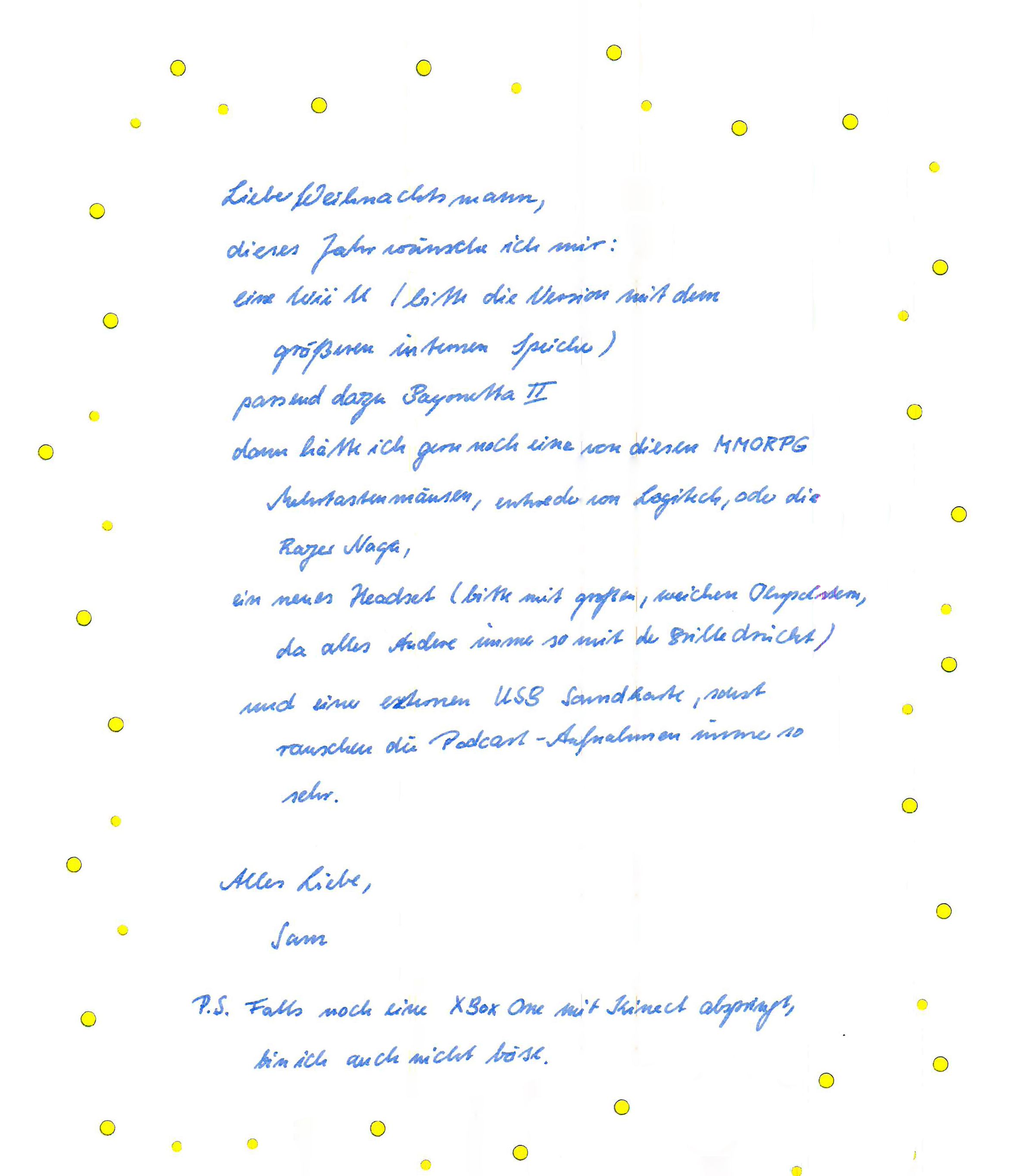 Lesezeit: < 1 MinuteJedes Jahr vor Weihnachten schreiben Tausende Kinder weltweit einen kleinen Brief, um ihre Wünsche dem Weihnachtsmann zu überbringen. Doch wer hat behauptet, dass nur Kinder solche Briefe schreiben dürfen? Wir von der IKYG-Redaktion sind der Meinung, dass auch wir dem (Gaming)-Weihnachtsmann sagen dürfen, dass wir artig waren und einige spezielle Wünsche haben. Aus diesem Grund präsentieren wir nun wöchentlich neue Wunschzettel. Heute: Sam.