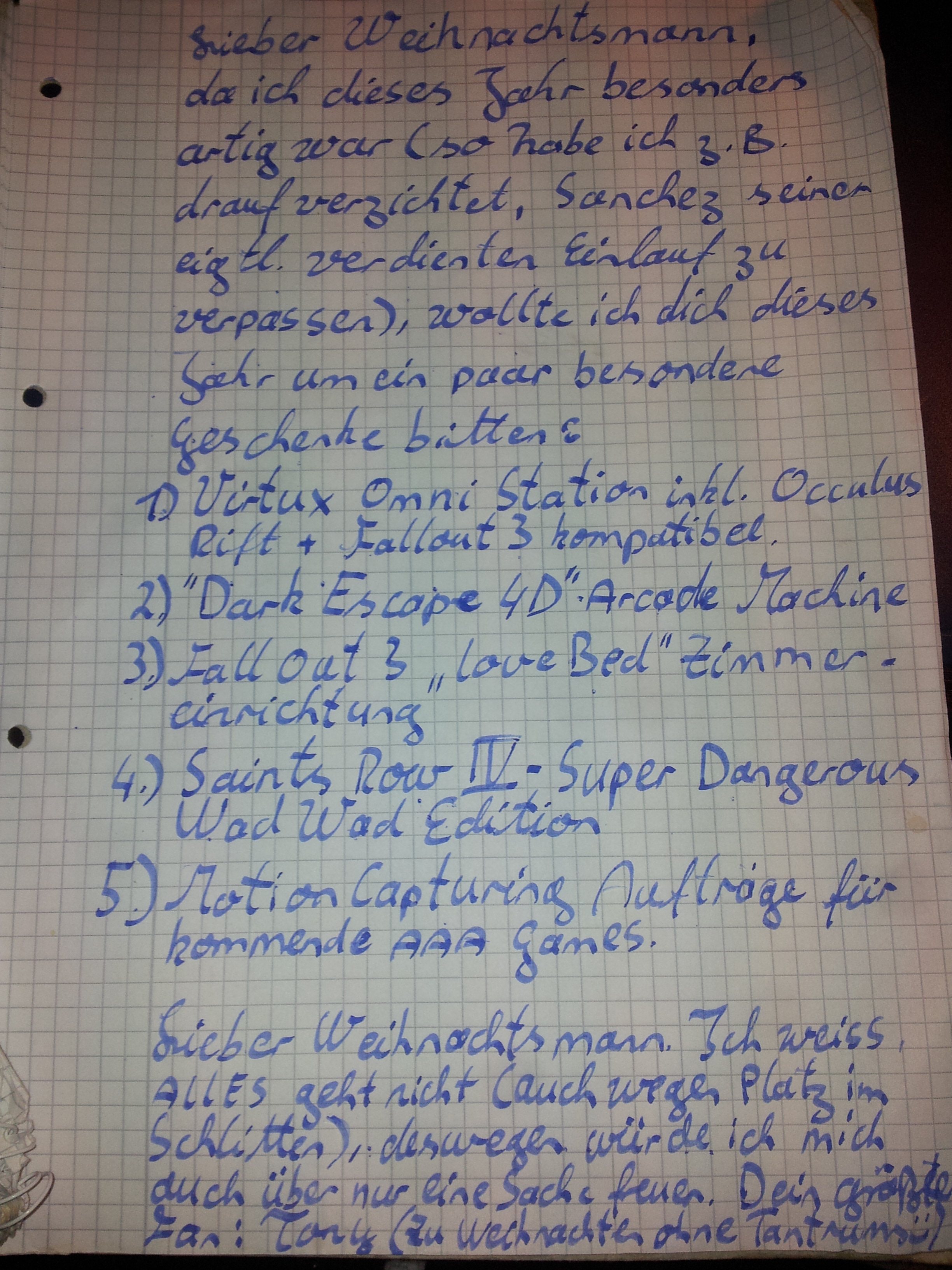 Lesezeit: < 1 MinuteJedes Jahr vor Weihnachten schreiben Tausende Kinder weltweit einen kleinen Brief, um ihre Wünsche dem Weihnachtsmann zu überbringen. Doch wer hat behauptet, dass nur Kinder solche Briefe schreiben dürfen? Wir von der IKYG-Redaktion sind der Meinung, dass auch wir dem (Gaming)-Weihnachtsmann sagen dürfen, dass wir artig waren und einige spezielle Wünsche haben. Aus diesem Grund präsentieren wir nun wöchentlich neue Wunschzettel. Heute:Tony
