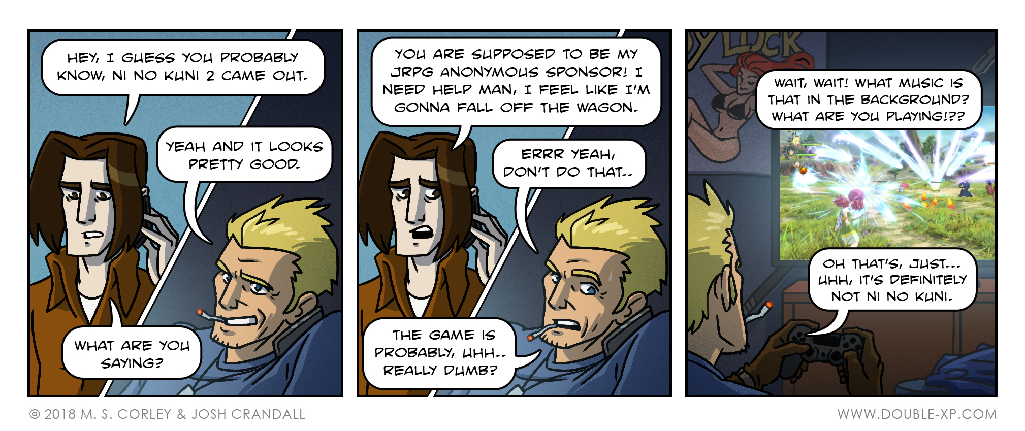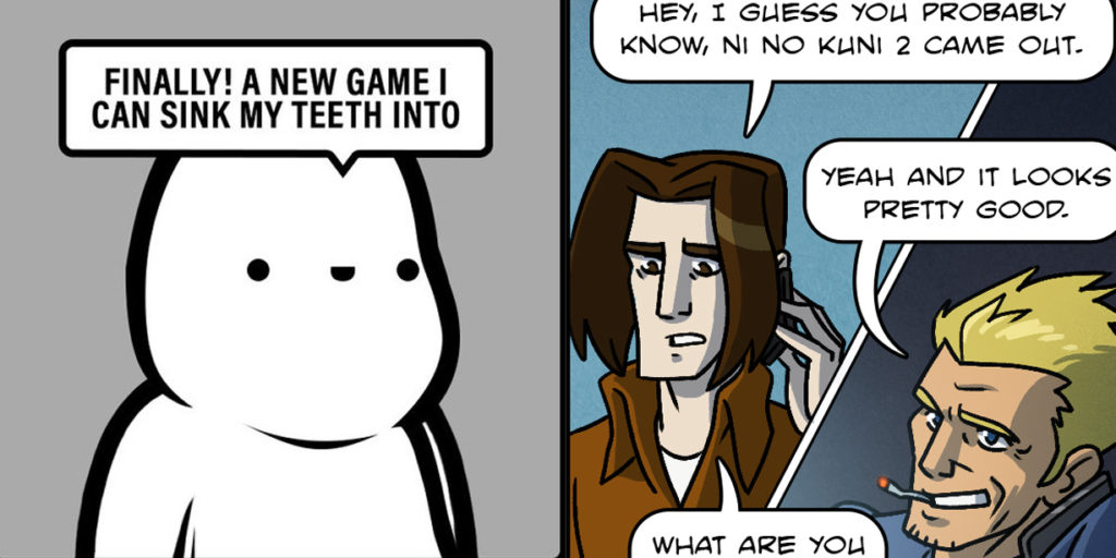 Alle Fans von JRPGS sind gerade aus dem Häuschen. Der Grund ist ein Spiel, das auf den Namen Ni no Kuni II hört. Nachdem bereits der Vorgänger nicht nur JRPG, sondern auch Anime-Fans – insbesondere von Werken aus dem Hause Studio Ghibli – begeistert hat, folgte nun der nächste Streich. In einer liebevoll gestalteten Welt, mit einem umwerfenden Soundtrack erlebt ihr so allerhand Abenteuer und helft den Bewohnern des Königreichs. Dass ihr euch dabei etwas im Spiel und seiner Welt verlieren könnt, ist dabei nicht überraschend. Genauso normal ist die Tatsache, dass kein Fan des Genres diesem Spiel widerstehen kann, egal wie stark der Wille auch sein mag. Zumindest wenn wir dem folgenden Comic von Double XP Glauben schenken.