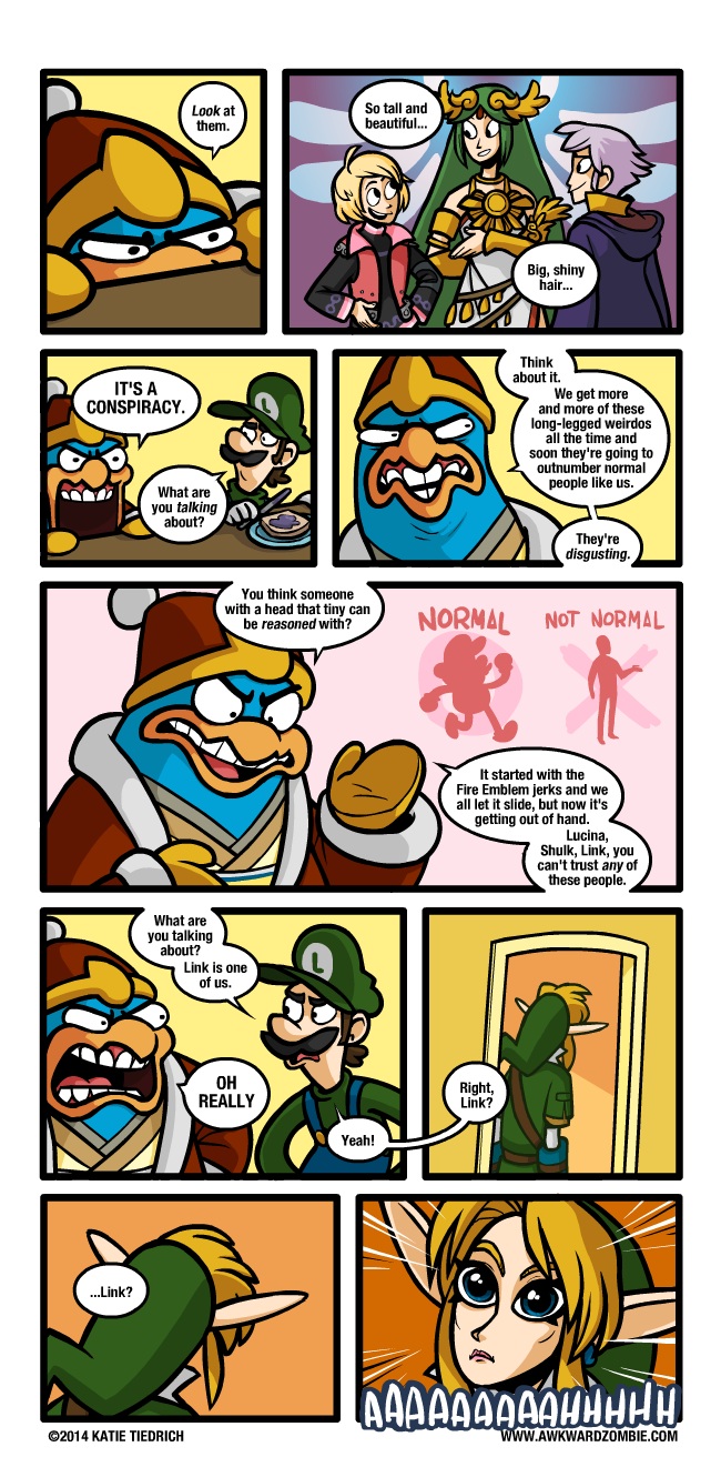 Super Smash Bros. und Nintendo an sich hat sich über die Jahre gewandelt. Während die Charaktere der ersten Generationen alle eher kleiner und “fülliger” waren, besitzt Nintendo heute auch Serien, wie Fire Emblem mit seinen typisch großen und schlanken Anime-Charakteren. Aber natürlich durchliefen auch die ursprünglichen Helden, wie Mario und Co. einen Wandel. Doch im Nintendo-Universum gibt es einige Bösewichte, allen voran König Dedede, die etwas gegen schlanke, große Protagonisten hat. “Zum Glück begleiten wir keinen solchen Charakter seit Jahren auf seinen Abenteuern”, denkt ihr euch. Ha, aber da habt ihr euch getäuscht, wie der folgende Comic aus dem Hause Awkward Zombie beweist.