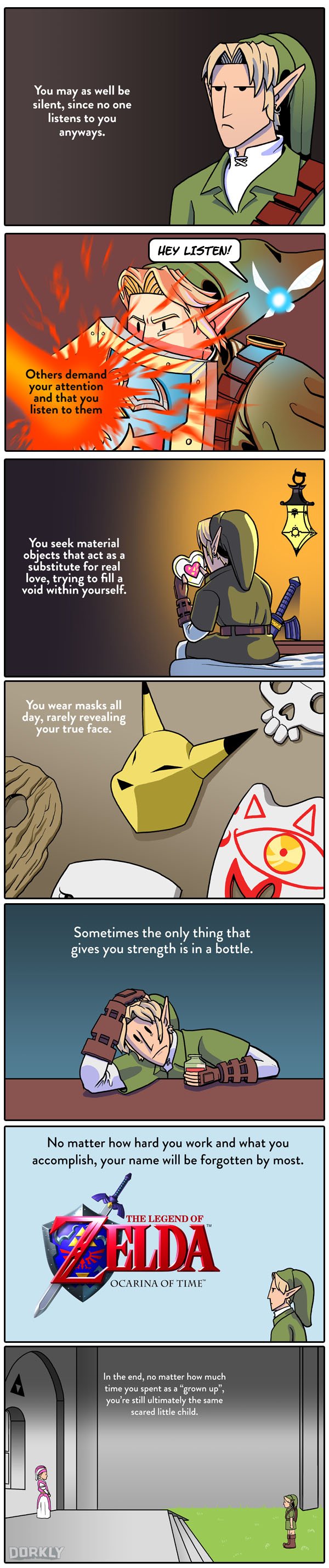 Julia Lepetit und Andrew Bridgman von Dorkly sind mit einem neuen Comic zu The Legend of Zelda zurück. Doch dieses Mal ist es keiner der witzigen oder skurrilen Vertreter, die sie sonst zeichnen, sondern einer der zum Nachdenken anregt. Wie sich nämlich herausstellt, sind wir alle Link ähnlicher, als einer zunächst annehmen würde. Zwar tragen wir selten eine grüne Tunika oder spielen auf einer Ocarina rum, auch können wir weder Zeit, noch Wind beeinflussen, aber ansonsten sind wir dem stummen Helden doch ziemlich ähnlich. Worin diese Ähnlichkeiten liegen, verrät euch der folgende Comic.