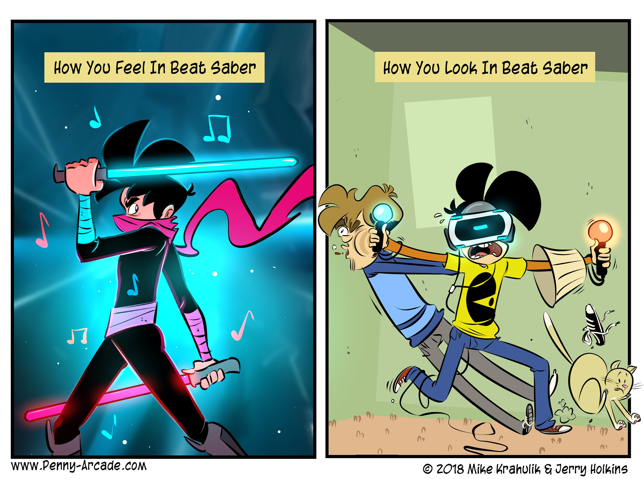 Aufmerksame Leser unserer Seite werden sicherlich bereits mitbekommen haben, dass Virtual Reality mein Erzfeind Nummer 1 ist. Mehr als einmal schon setzte ich das Virtual-Reality-Headset schweißgebadet und mit extrem flauen Gefühl im Magen ab und schwor mir nie wieder einen neuen Versuch zu starten. Trotzdem wird es immer wieder vorkommen, alleine aufgrund der Palette an interessanten Spielen. Ein solches Spiel ist mit ziemlicher Sicherheit Beat Saber. Auch wenn es sich bei dem Titel um ein Rhythmusspiel handelt und somit gar nicht zu meinen Lieblingsgenres zählt, würde ich dem Ganzen gerne eine Chance geben. Allerdings sollte ich das am besten bei jemanden anders ausprobieren, da der Bereich um meinen Fernseher etwas zu voll gestellt ist. Sonst endet mein Versuch wie bei den Jungs von Penny Arcade.