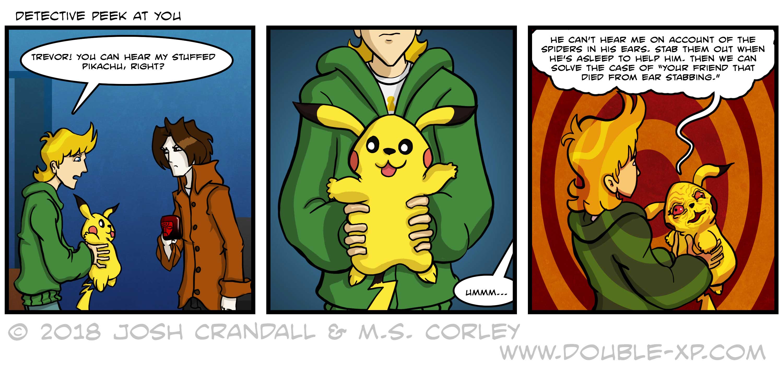 Der Trailer der Verfilmung von Meisterdetektiv Pikachu ließ das Internet explodieren. Nicht nur gab es zig Artikel zum Design der Pokémon, sondern auch zur Synchronarbeit von Ryan Reynolds und sogar zur deutschen Version des Films. Ob der Film gut oder schlecht wird, vermag aktuell noch niemand zu sagen. Unterhalten wird er wahrscheinlich schon. Josh Crandal und M.S. Corley haben den Trailer auch gesehen und für Double XP einen Comic entworfen, der in eine etwas andere Richtung geht. Wobei “andere Richtung” gleichbedeutend mit “Pikachu Horrorfilm” ist.