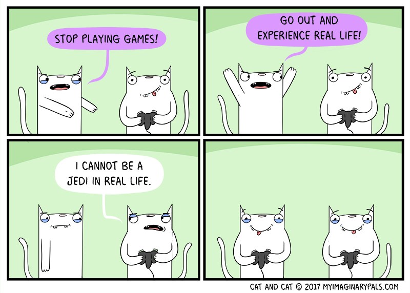 Viele Eltern, Freunde oder Partner verstehen den Reiz von Videospielen nicht. Das ist auch völlig in Ordnung, denn jeder hat schließlich seine eigenen Vorlieben. Problematisch wird das allerdings, wenn jemand versucht euch eines Besseren zu belehren und vom besten Hobby der Welt – den Videospielen – abzubringen. Im folgenden Comic von Cat and Cat Comic geht es genau um diesen Fall. Doch der betroffene Kater hat eine sehr schlaue Antwort auf dieses Problem, das sogar seinen Freund restlos zu überzeugen scheint. Wenn es doch nur auch im echten Leben immer so einfach wäre.