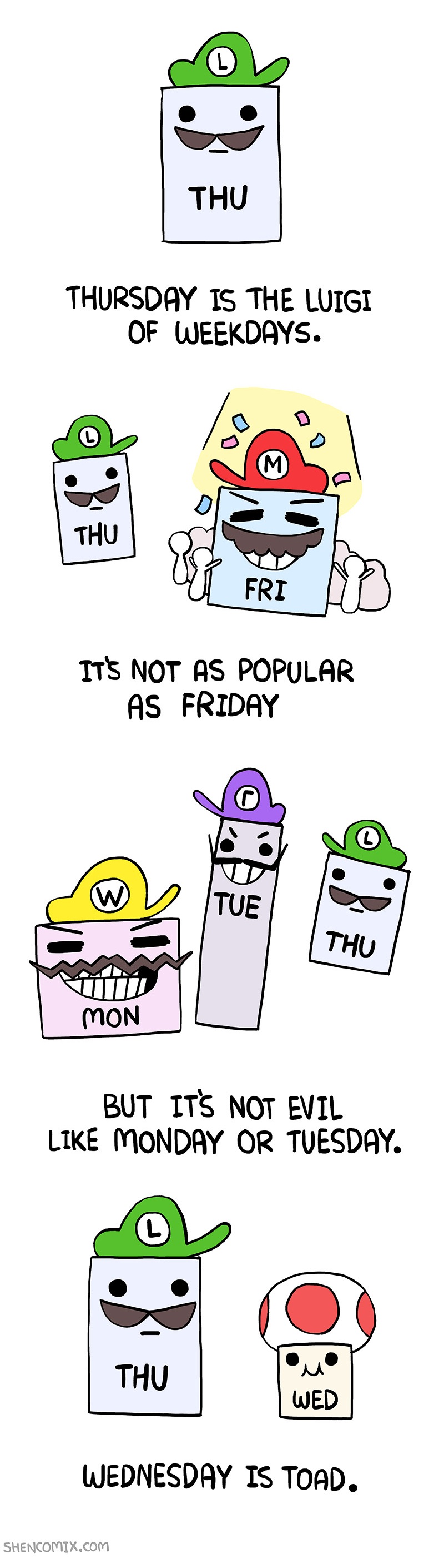 Habt ihr euch schon Mal Gedanke darüber gemacht, ob eine bestimmte Figur aus eurer Lieblingsserie oder eurem Lieblingsspiel mit einem Wochentag gleichzusetzen ist? Gerade durch das Internet kommen schließlich die komischsten Personen auf die skurrilsten Ideen. Welche Figur steht zum Beispiel für den geliebten Freitag? Welche ist der verhasste Montag und welche steht genau in der Mitte am Mittwoch? Shenanigansen von Shencomix hat sich dieser Frage angenommen und den Wochentagen bekannte Gesichter aus dem Pilzkönigreich zugeordnet. Welche Figur welchem Wochentag entspricht, seht ihr im Folgenden.