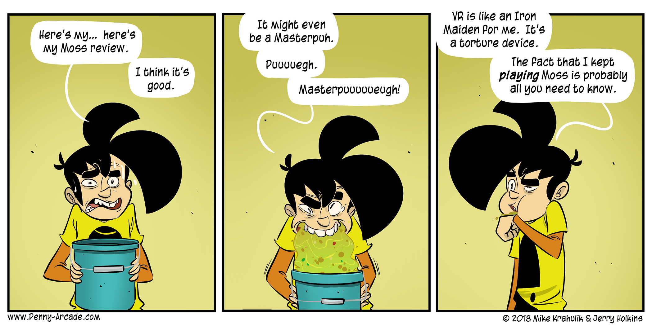 Werdet ihr schnell reisekrank? Wenn nicht, seid froh. Es gibt gefühlt nichts Schlimmeres, als wenn einem in einem Stadtbus übel wird. Doch nun stellt euch Mal vor, wie euer Körper auf VR reagiert, wenn schon ein Bus zu viel ist. Die Lösung: Es ist nicht schön. So interessant VR auch sein mag, so unwahrscheinlich wird es sein, dass ich mir in naher Zukunft ein solches Gerät anschaffe. Die einzige Ausnahme: Wenn ein wirklich gutes Spiel erscheinen würde, das durch den Einsatz der VR-Technologie nur noch besser wird. Aber selbst dann wäre mein Urteil wahrscheinlich so ähnlich wie im folgenden Comic von Penny Arcade.