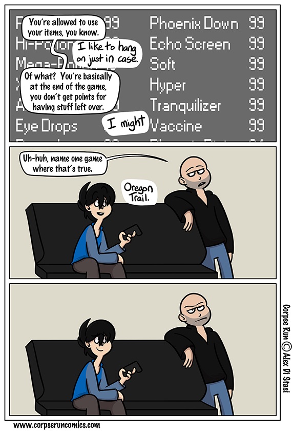 Den Anfang macht heute ein Comic von Corpse Run Comics, in dem Alex Di Stasi ein bekanntes “Problem” von Rollenspielfans beleuchtet. Je länger ein Rollenspiel nämlich geht, desto mehr Gegenstände wird der Spieler ansammeln. Das an für sich ist keine schlechte Sache, da Heiltränke und dergleichen in brenzligen Situationen nie überflüssig sind. Problematisch wird es allerdings dann, wenn die Spieler die Gegenstände nur sammeln, sie aber nie einsetzen. Was bringen einem 99 Heiltränke, wenn sie doch nur im Inventar versauern. Aber andererseits, wer weiß, ob wir sie nicht doch noch gebrauchen können.