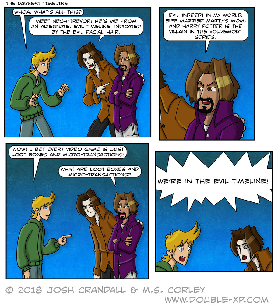Als Fan von Zeitreisen und medialen Inhalten, in denen diese und andere Sci-Fi-Elemente thematisiert werden, habe ich auch schon viele Gedanken an die Viel-Welten-Theorie verschwendet. Die Wahrscheinlichkeit, dass es eine schier unendliche Zahl an Parallelwelten geben könnte, die sich nur minimal von unserer unterscheiden, erscheint mir persönlich plausibel. Natürlich ist es aber auch nicht in jeder dieser Alternativwelten schön und friedlich. In Filmen wie Zurück in die Zukunft sehen wir, im zweiten Teil, auch die Ausmaße die eine kleine Änderung auf die Gegenwart haben kann. Die “Darkest Timeline”, also die schlimmstmögliche Parallelwelt, ist in solchen Filmen oder Serien ein beliebtes Stilmittel. Nicht selten haben die Figuren aus diesen Welten offensichtliche Merkmale, die sie von ihrem anderen Ich unterscheiden. Im folgenden Comic von Double XP gibt es daher nicht nur eine Figur mit Bart zu sehen, sondern sie erzählt auch von ihrem Leben in der “Darkest Timeline” mit weitreichenden Konsequenzen.