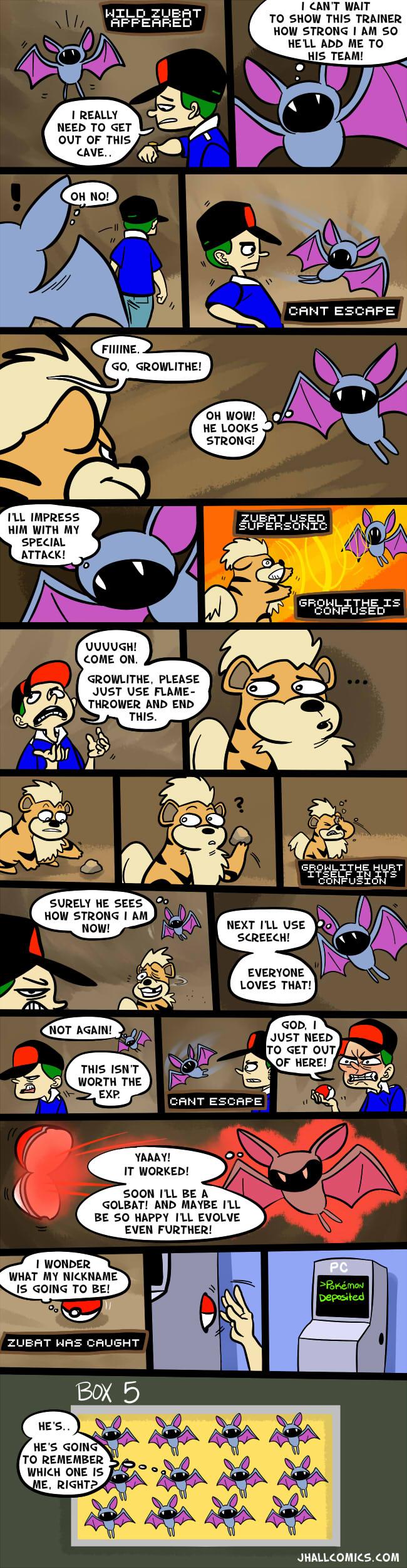 Der zweite Comic beschäftigt sich mit einem Thema, das (vor allem mir) nur allzu bekannt ist. Justin Hall erdachte und zeichnete einen Comic für seine Seite JHall Comics, der mit dem Thema Zubat zu tun hat. Für diejenigen, die mit dem Pokémon “Zubat” nichts anfangen können: Es handelt sich dabei um ein nerviges Fledermaus-Pokémon, das in Höhlen alle zwei Schritte auftaucht. Das ist an für sich nicht das Problem, wenn diese Zubats nicht jegliche Flucht verhindern würden. Somit bleibt es einem, sofern kein Schutz-Item verfügbar, nicht erspart alle Zubats zu fangen. Schlussendlich erwartet sie aber alle dasselbe Schicksal.