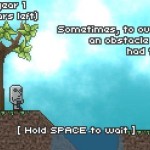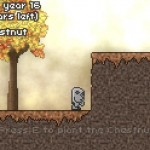 Wo wir gerade von ihr sprachen. Die Zeit ist das wichtigste und zentrale Gameplay-Element in diesem Flashgame. Denn solange ihr eure Leertaste gedrückt haltet, wird die Zeit unaufhörlich in steigender Geschwindigkeit voranschreiten. Zunächst sind es ein paar Monate, die einhergehen, Jahreszeiten, die wechseln. Doch schon nach einiger Zeit wird der Spieler merken, dass es die Anzeige in der oberen linken Ecke Jahreswechsel vermeldet. Aber Obacht, denn mit steigender Jahreszahl rückt auch die große Katastrophe immer näher. Gesteuert wird der Charakter mit den Pfeiltasten links und rechts. Die obere und untere Pfeiltaste wird nur beim Klettern benötigt. Damit ihr auch etwas habt, worauf ihr klettern könnt, müsst ihr euch eurer E-Taste bedienen und beispielsweise eine Kastanie aufheben. Diese könnt ihr anschließend an einem passenden Ort einpflanzen und mit der Zeitraffer-Funktion einen Baum sprießen und wachen lassen. Auch ist es an späterer Stelle wichtig die Zeit zu beeinflussen, um beispielsweise eine Brücke entstehen zu lassen, damit ihr vorankommt.