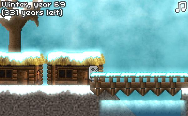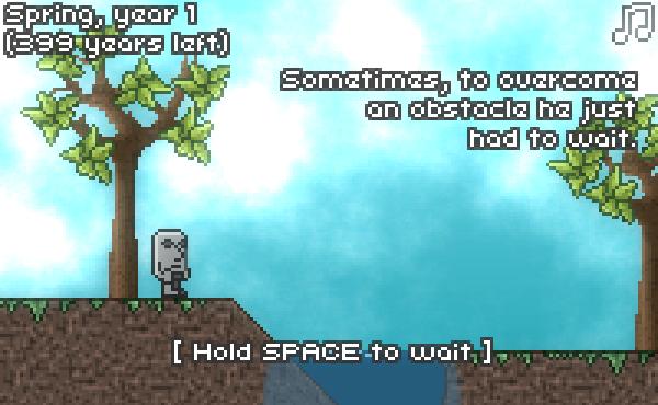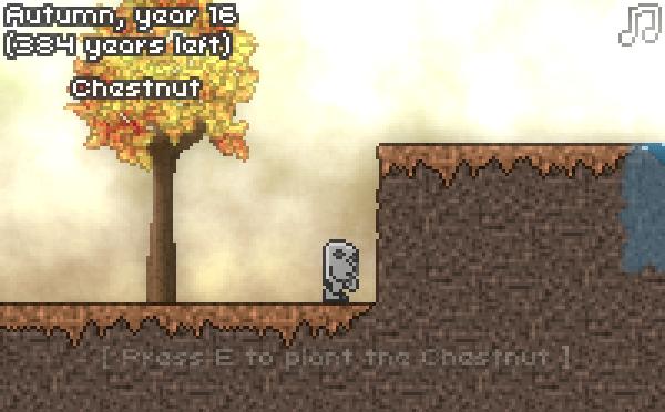 Wo wir gerade von ihr sprachen. Die Zeit ist das wichtigste und zentrale Gameplay-Element in diesem Flashgame. Denn solange ihr eure Leertaste gedrückt haltet, wird die Zeit unaufhörlich in steigender Geschwindigkeit voranschreiten. Zunächst sind es ein paar Monate, die einhergehen, Jahreszeiten, die wechseln. Doch schon nach einiger Zeit wird der Spieler merken, dass es die Anzeige in der oberen linken Ecke Jahreswechsel vermeldet. Aber Obacht, denn mit steigender Jahreszahl rückt auch die große Katastrophe immer näher. Gesteuert wird der Charakter mit den Pfeiltasten links und rechts. Die obere und untere Pfeiltaste wird nur beim Klettern benötigt. Damit ihr auch etwas habt, worauf ihr klettern könnt, müsst ihr euch eurer E-Taste bedienen und beispielsweise eine Kastanie aufheben. Diese könnt ihr anschließend an einem passenden Ort einpflanzen und mit der Zeitraffer-Funktion einen Baum sprießen und wachen lassen. Auch ist es an späterer Stelle wichtig die Zeit zu beeinflussen, um beispielsweise eine Brücke entstehen zu lassen, damit ihr vorankommt.