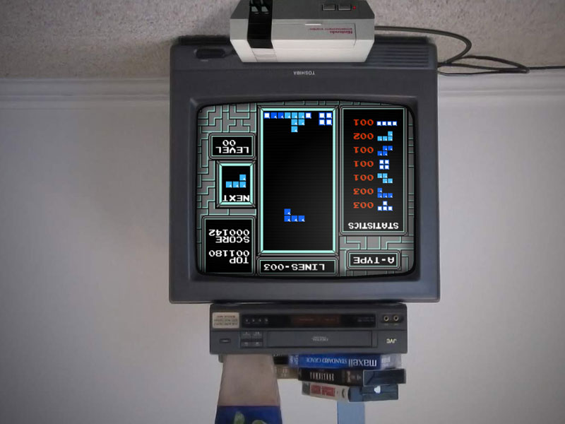 Dennoch konnte mich dieses Spiel mit dem eingängigen Namen First-Person-Tetris recht lange an den Bildschirm fesseln. Denn auf den ersten Blick offeriert das Spiel wahrhafte Retro-Kost. Ein beinahe quadratischer Röhrenfernseher, ein Videorekorder und diverse VHS-Kassetten darauf, ein NES auf dem Boden vor der Mattscheibe. Und darauf flimmert, stilecht das gute, alte NES-Tetris.
