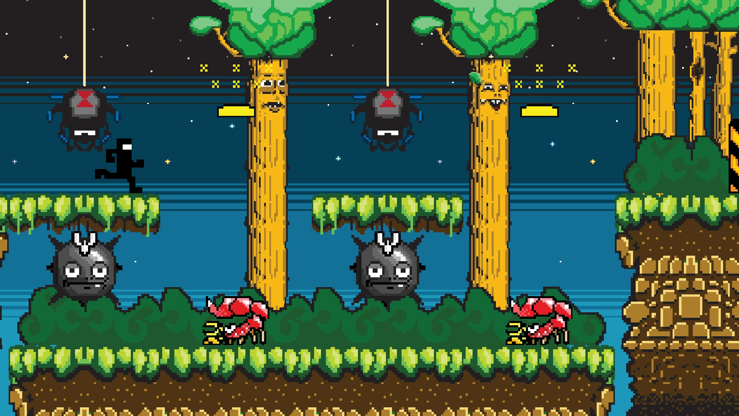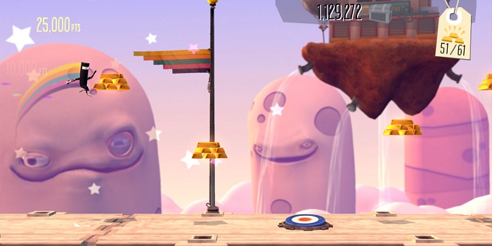 Zu Beginn scheint alles noch ganz entspannt zu sein. Man hüpft hier und da über Gegner und tritt eine Wand ein, aber so nach und nach nimmt die Geschwindigkeit zu, die Aktionen mehren sich und plötzlich setzt das Fluchen ein, dass zu einem Jump ‘n’ Run einfach dazu gehört. Side-Scroll-typisch bewegt sich der Bildschirm von links nach rechts. Commander Video rennt von selbst und es liegt an uns zu springen, zu treten, feindliche Geschosse zu blocken, ducken und noch einiges mehr. Der Schwierigkeitsgrad wächst kontinuierlich mit den neu gewonnenen Fertigkeiten, man kann sich jedoch innerhalb der Level gelegentlich noch zwischen dem schwierigen und dem leichten Pfad entscheiden. Der schwierige Weg führt allerdings meistens zu einem alternativem Ausgang oder einer Truhe. Truhen beinhalten neue Outfits oder neue Charaktere werden freigeschaltet. Nicht nur das, sondern auch eine Zielscheibe für Bonuspunkte, die am Ende eines perfekt gespielten Levels wartet, sorgen für einen hohen Wiederspielwert. Die Elemente, die es innerhalb eines Levels einzusammeln gilt, sind kleine Goldbarren und rote “Plus”-Zeichen. Jeder eingesammelte Goldbarren oder geblocktes Geschoss gibt einen Ton von sich, der sich in die Hintergrundmusik einfügt. Jedes Plus fügt mehr Noten zur Melodie hinzu und lässt sie lebhafter werden. Genau diese Spielelemente machen den Geist dieses Side-Scroll-Plattformers aus und bringen Rhythmus ins Spiel.