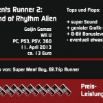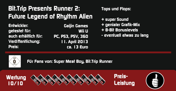 Bit.Trip Presents Runner 2: Future Legend of Rhythm Alien ist ein gelungener Nachfolger und hat es geschafft, seinen Vorgänger noch bei Weitem zu übertreffen. Vor allem durch einen guten Soundtrack und dem Grafik-Mix wird dieser Titel zu einem der besten Jump ‘n’ Runs seit langem. Die Level-Anzahl ist fast schon zu viel des Guten und könnte so manchen Gamer langweilen, ich habe mich jedoch bestens unterhalten gefühlt und war von der ersten bis zur letzten Stage am Ball. Das Wiederspielpotenzial ist sehr verlockend und bringt noch einige Extraminuten Unterhaltung für Zwischendurch. An die immer komplizierter werdenden Tastenabfolgen gewöhnt man sich zwar, man muss aber auch die Konzentration strikt aufrecht erhalten, sonst landet man schnell wieder am Anfang des Levels und das frustet enorm. Alles in allem eine absolut uneingeschränkte Kaufempfehlung für jeden Jump ‘n’ Run-Liebhaber und alte Hasen, die Lust auf das Retro-Feeling der Bonuslevel haben.
