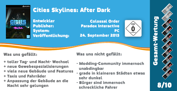 Lesezeit: 3 MinutenImmer strahlender Sonnenschein und ein obligatorisches Wölkchen oder ein bisschen Nebel irgendwann am Tag, so kennen wir bis jetzt unsere Städte in Cities: Skylines. Da ist es doch mal eine willkommene Ablenkung unsere in ewiges Sonnenlicht getauchte Stadt auch mal von ihrer dunklen Seite zu sehen. Denn wir wissen doch alle, das die dunkle Seite Kekse hat, oder? Lehnt euch also zurück, schnappt euch ein Piña Colada und genießt den Sonnenuntergang, während auf den Straßen langsam die Laternen angeknipst werden.