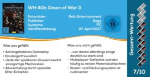 Ich habe bisher jeden Teil von Dawn of War gespielt, besitze jedes Addon, ja selbst Soulstorm und doch wurde ich mit Dawn of War III nicht so richtig warm. Warum ist das so? Im Grunde gefällt mir ja doch vieles von diesem Spiel. Ich mag das Geballer, ich mag die Besonderheiten der drei Rassen, die Tatsache, dass man sie alle irgendwie mal im Verlauf der Kampagne kennenlernt und doch bin ich nicht zufrieden. Die Trivialisierung des Bau- und Deckungssystems, wie auch die erzwungene Freischaltung von Mulitplayer-Inhalten stoßen mir einfach auf. Da tut es der Gesamtwertung auch nicht gut, wenn Multiplayer-Gefechten deutlich die MOBA-Ausrichtung anzusehen ist und wir mit einiger Sicherheit sagen können, dass weitere spielbare Rassen und andere Inhalte demnächst mit entsprechenden Preisschild folgen werden. Ein schlechtes Spiel ist Dawn of War III aber trotzdem nicht, denn Abseits all dieser Kritikpunkte ist es immer noch ein ansehnliches Stück digitaler Unterhaltung, das insbesondere Einsteigern den Zugang zu den Wirren des 41. Jahrtausends schmackhaft machen könnte.