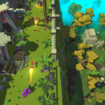 Durch die vorhandene Serious Sam-Lizenz schlachten wir uns also alleine, oder im Zweispieler-Coop, durch die bekannten Gegner aus den Klassikern. Die haben allerdings einen neuen Look bekommen. Denn I hate running backwards arbeitet mit einer Voxel-Grafik. Die ist zwar etwas gewöhnungsbedĂĽrftig, gibt dem Spiel aber einen passenden Retro-Vibe ohne veraltet zu wirken. Neben Shotgun und Sturmgewehr, die man direkt zu Beginn des Spiels in die Hand gedrĂĽckt bekommt, können wir auĂźerdem verschiedene Spezialwaffen finden. Diese sind, Serious Sam-typisch nicht einfach nur bekannte SchieĂźeisen. Neben einer aufladbaren Blitz-Kanone, viel uns auch ein Regenschirm in die Hände, der in alle Richtungen Kugeln verschieĂźt. Das sorgt nicht nur fĂĽr ordentlich Chaos und Action auf dem Bildschirm, sondern auch fĂĽr einiges an Abwechslung. Das wichtigste, und das erwähnte mein Coop-Partner Bernard Bachrach (CEO von Binx Interactive) SEHR oft, ist aber der Hammer. “The Hammer is almighty! It’s the most important Weapon! Remember the Hammer!” Und er ist wirklich cool. Denn man kann mit ihm nicht nurGegner zermatschen und sogar Raketen zurĂĽck schleudern. Auch die komplette Umgebung lässt sich mit ihm begradigen. Denn die fĂĽnf Welten von I hate running backwards sind vollständig zerstörbar. Jeder Baum und jede Ruine die von oben ins Bild rutscht kann demoliert werden. Das macht nicht nur unglaublich viel SpaĂź, sondern liefert auch Heilitems und Waffenkisten. Und die braucht man auch. Denn jede Welt endet mit einem Boss, der nicht nur ĂĽber viel Leben, sondern auch eigene Angriffsmuster und Mechaniken verfĂĽgt. Damit es mit der Zeit nicht langweilig wird, werden die Level zudem alle prozedural generiert und sehen bei jedem Durchlauf anders aus. AuĂźerdem stehen neben Serious Sam auch noch weitere Charaktere mit anderen Eigenschaften (Leben, Geschwindigkeit etc.), Besonderheiten und Spezialangriffen zur VerfĂĽgung.